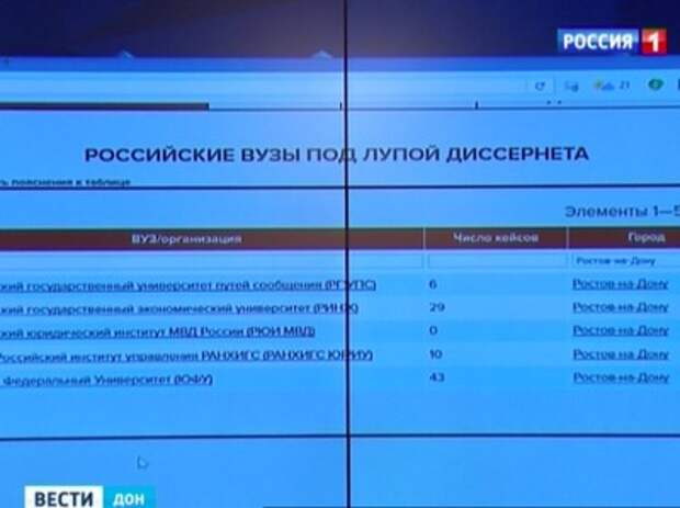 Активисты проекта "Диссернет" обнаружили фальшивые научные работы в пяти ростовских вузах: ЮФУ, РИНХе, РГУПСе , а также в Ростовском юридическом институте МВД России и в Южно-Российском институте управления. Об этом руководитель "Диссернет" заявил на пресс-конференции в Ростове-на-Дону. Обществен