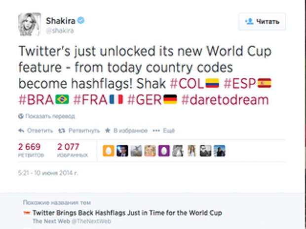 К началу чемпионата мира по футболу в Бразилии сеть микроблогов Twitter позволила добавлять "хэшфлаги" - когда хэштег, содержащий трехбуквенное обозначение страны, сопровождается иконкой национального флага. Эта функция позволит болельщикам внимательнее следить за успехами стран-участниц ЧМ-2014.